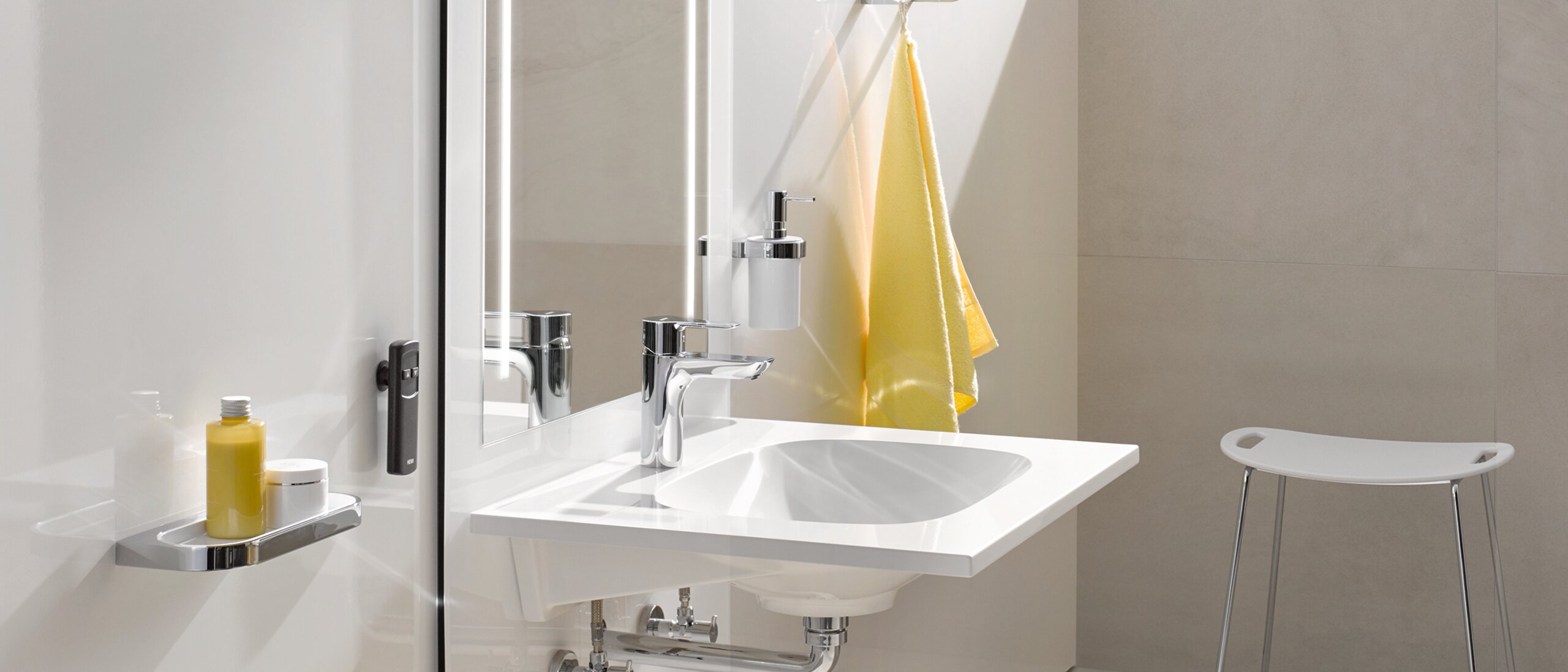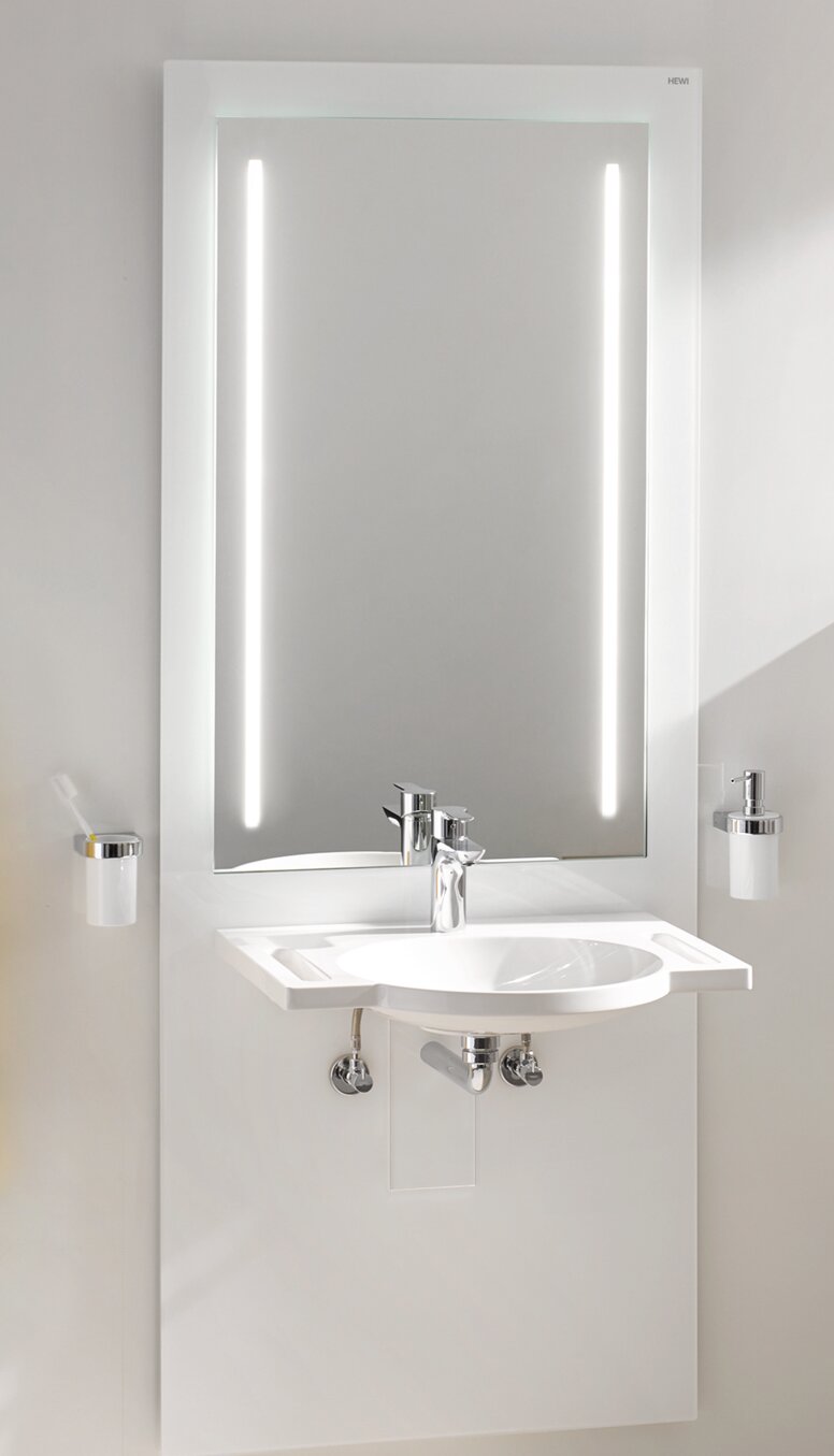 In der Praxis bewähren sich solche barrierefreien Spiegel Lösungen vor allem in Mehrgenerationen-Bädern, Pflegeeinrichtungen oder barrierefreien Hotels, wo mehrere Personen denselben Waschplatz verwenden. Einige Hersteller bieten hierfür bereits modulare Systeme mit integriertem Spiegel an. Eine solche Lösung ist beispielsweise im System S 50 von HEWI umgesetzt: Der höhenverstellbare Waschtisch mit integrierter Spiegelfläche ermöglicht eine stufenlose Anpassung per Fernbedienung und fügt sich mit klarer Linienführung und optionaler Beleuchtung harmonisch in das Gesamtdesign ein.