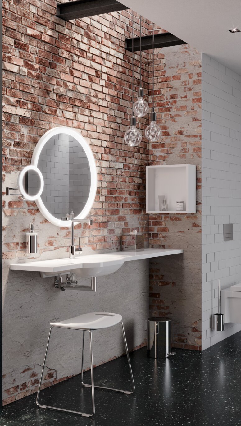 Ohne Tageslicht braucht ein fensterloses Bad andere Lichtquellen. Zwingend notwendig sind daher Lampen, um den Raum zu erleuchten. Eine einzelne Lampe reicht für eine gute Ausleuchtung nicht aus. Als Ergänzung bieten sich Einbaulampen in Wand, Decke oder Boden an. Strahler oder indirekte Beleuchtungen, zum Beispiel im Spiegel, gestalten ein innenliegendes Bad atmosphärisch. Bei der Wahl der Leuchtmittel ist es vorteilhaft, nicht zu helles Licht zu verwenden. Kalte, helle Lampen verleihen einem Raum eine sterile Optik. Warme Beleuchtung hingegen fördert den Wohlfühlcharakter. Möchten Ihre KundInnen nicht auf Tageslicht im Bad verzichten, sind gegebenenfalls Oberlichter oder Fenster zu Nebenräumen die Lösung. Im barrierefreien Bad empfiehlt sich der Einsatz eines Kippspiegels mit LED-Beleuchtung. Der Spiegel lässt sich mit Kurbel und Seilzug um bis zu 28 Grad neigen – und lässt sich daher problemlos im Stehen und Sitzen verwenden.