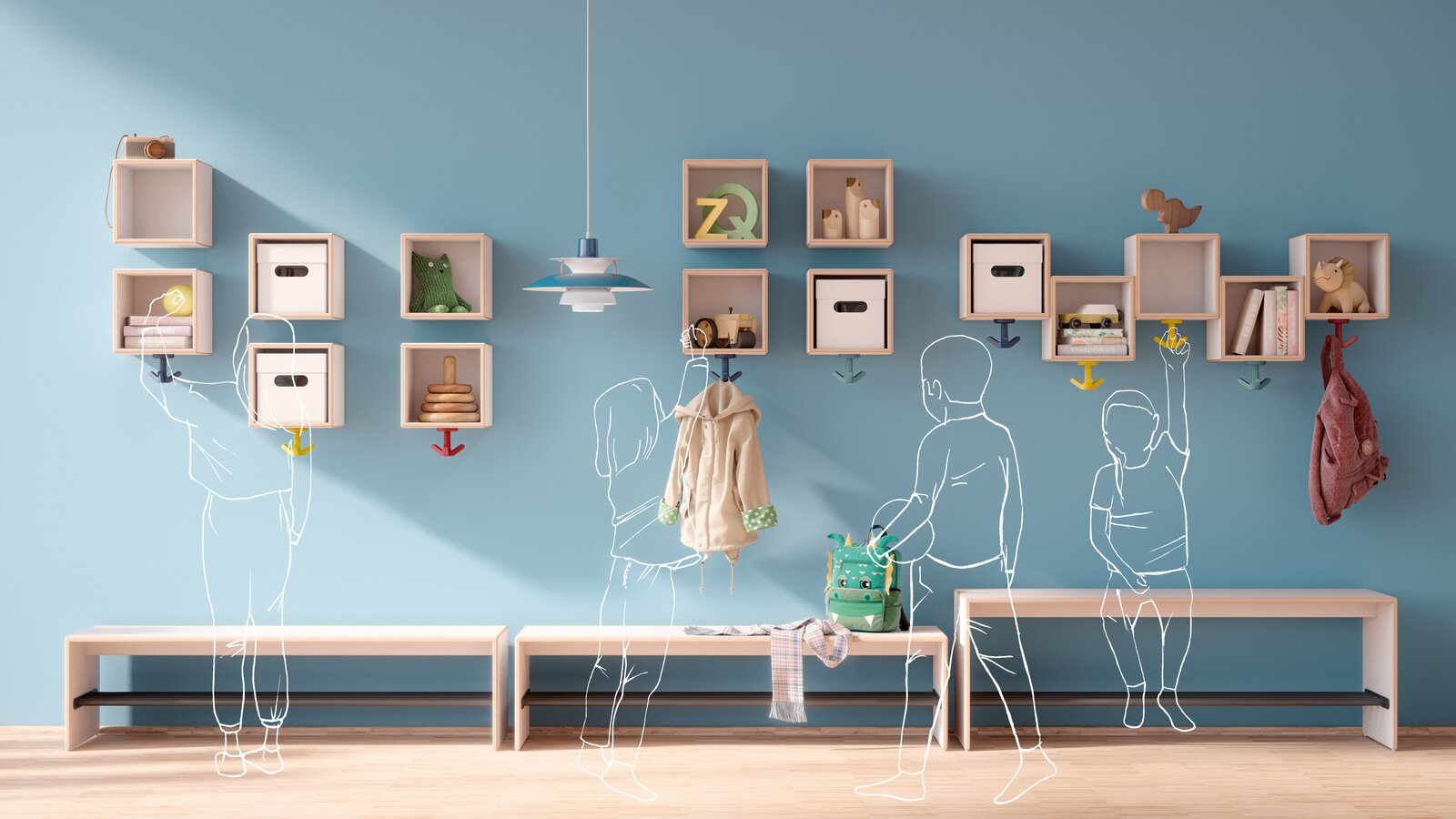 Ein wichtiger Ort in jeder Kita ist der Eingangsbereich. Im besten Fall bietet er Orientierung, stellt relevante Informationen für die Eltern bereit, z. B. über ein schwarzes Brett, und wirkt einladend. Flexibles Mobiliar, wie Hängeregale, bieten die ideale Lösung für den Garderobenbereich für. Mit Stauraum, Dreifachhaken und in 16 unterschiedlichen Farben passen sie zum jeweiligen Farb- und Raumkonzept einer Kita.