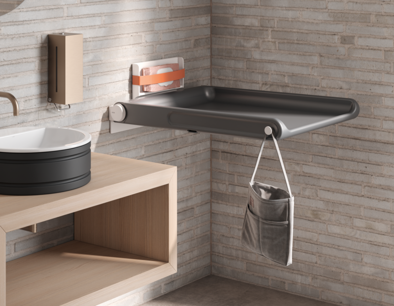 The new HEWI baby changing table combines an easy-to-clean lying surface made of PUR foam in iron grey with robust metal components in matt grain white. The braked fold-down function enables smooth handling, while side hooks and a clamp compartment offer additional comfort and convenience. The changing table combines the highest safety standards and comfortable handling with a modern design that blends seamlessly into public sanitary areas. The baby changing table was designed by Holscher Design, a renowned and award-winning strategic product design agency from Denmark with over 50 years of experience.
