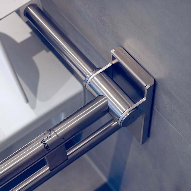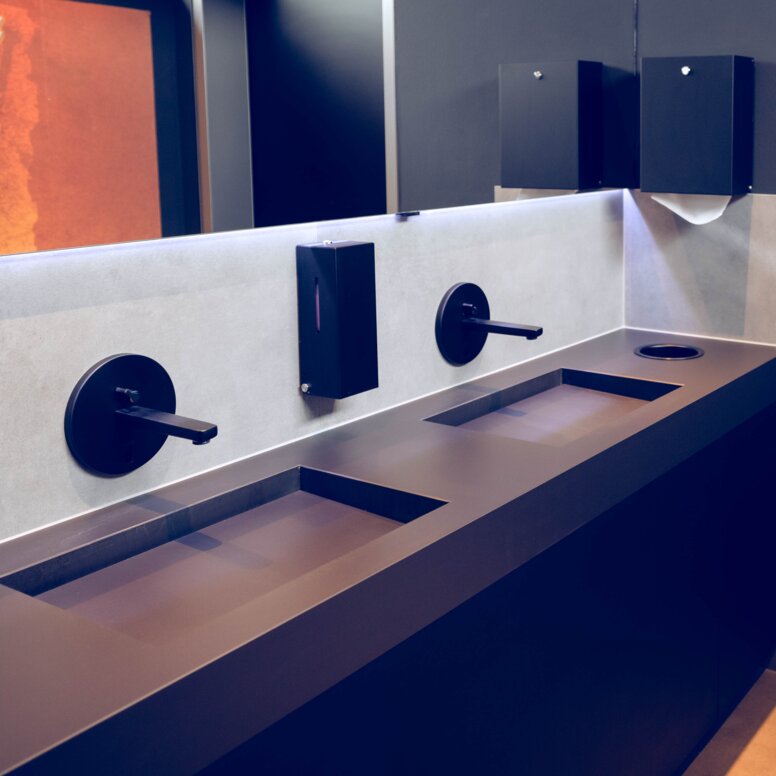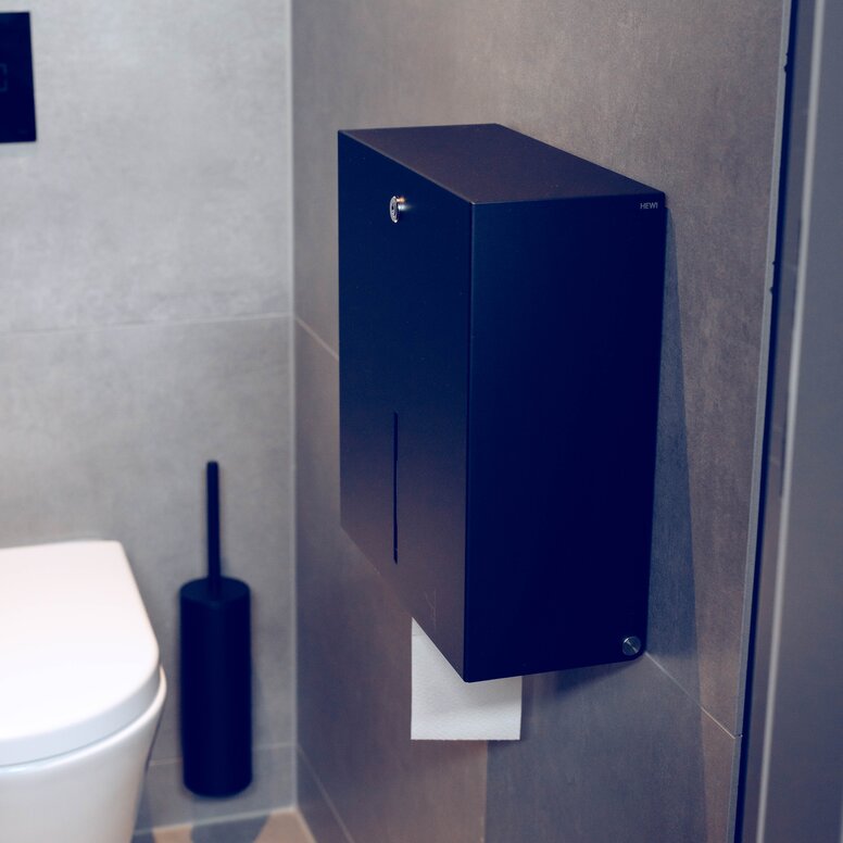 The durable and robust accessories from HEWI System 900 were also chosen to match the black matt HEWI door fittings, as well as the black washbasin fittings and dark surfaces in the new washrooms: HEWI Sensoric soap dispensers, paper towel dispensers, waste bins and toilet brush sets are used, all of which are made of high-quality stainless steel and powder-coated in elegant deep matt black. System 900 meets the requirements of a wide range of building types, especially in highly frequented locations such as public buildings and restaurants, and impresses with its functionality, durable quality, clever installation technology and hygienic design. The folding support rail in the WC is also from the 900 series, which was essentially developed for accessible bathrooms and offers an impressive combination of reliable quality and sophisticated technical details.