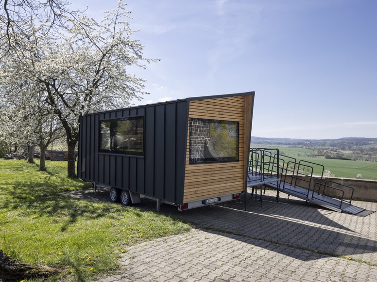 Christian Bock: It was particularly important to us that the Tiny Rolli House is wheelchair accessible but still retains the charm of a tiny house. It should in no way have a "nursing home" or "hospital" feel. At the same time, there should be important functions so that Mr Conrad can move around the tiny house independently. These include, for example, grab rails or a shower seat in the bathroom. However, we did not want to focus on his deficits, but rather to support him in the best possible way. The Tiny Rolli House should have a positive influence on its residents. The appearance and the design language should not be neglected. A special feature of the house is certainly the ramp that allows wheelchair users to access the tiny house comfortably. For a good tyre grip, we have laid a designer floor. A pull-out refrigerator, a wheelchair accessible heated table and a sink and stove-top within easy reach provide the desired living comfort. The small area has even proved to be an advantage for Mr Conrad: he has all the most important things in a small space and just has to turn around. From his bed, he can pull himself straight to the toilet without using his wheelchair.