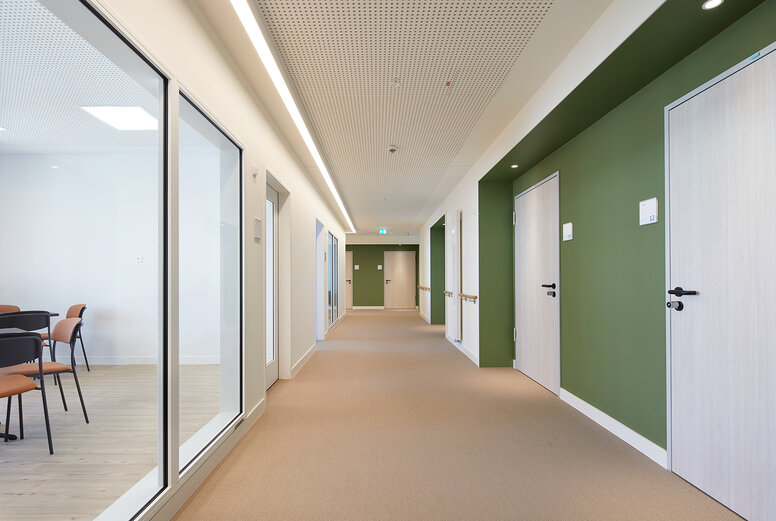 “The treatment concept is geared towards the realities of life and prepares patients specifically for everyday situations,” explains Dr Matthias Wilkening, Managing Partner of Wahrendorff. For example, there are various everyday training locations such as utility rooms and a “launderette”. The architecture of the building, with its skilful combination of indoor and outdoor spaces and a variety of lounges and meeting areas such as terraces, loggias, corridor extensions and group rooms, supports guests' needs for private and sheltered retreats or for social interaction. There are many opportunities here to find your way back into public life at your own pace.