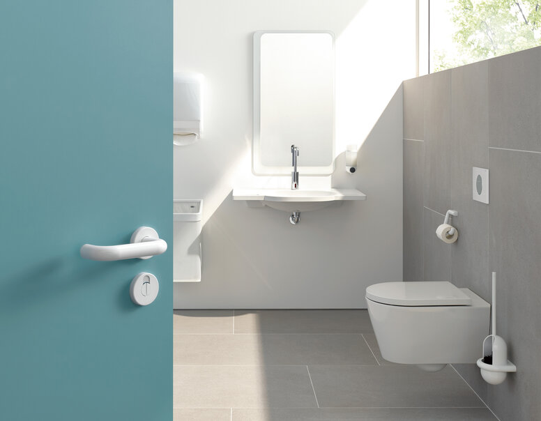 With the supportive products of the WARM TOUCH design, planners can offer maximum comfort. WARM TOUCH combines the optical properties of high-gloss chrome surfaces with the haptic properties of polyamide and thus offers an alternative to conventional, cold chrome products. For patients with increased sensitivity to cold or older people in particular, the warm alternatives are more comfortable to grip and are an ideal solution in terms of healing architecture.