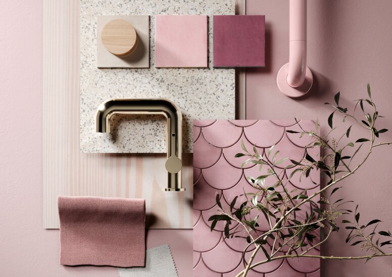 Pink is particularly effective in combination with white, brass, berry tones and calming patterns. Used in harmony, these colours establish a visual balance between clarity, warmth and depth. White contributes calm and structure, brass lends elegance, berry nuances add specific accents – and soft patterns make the spaces feel cosy and break their sterility.