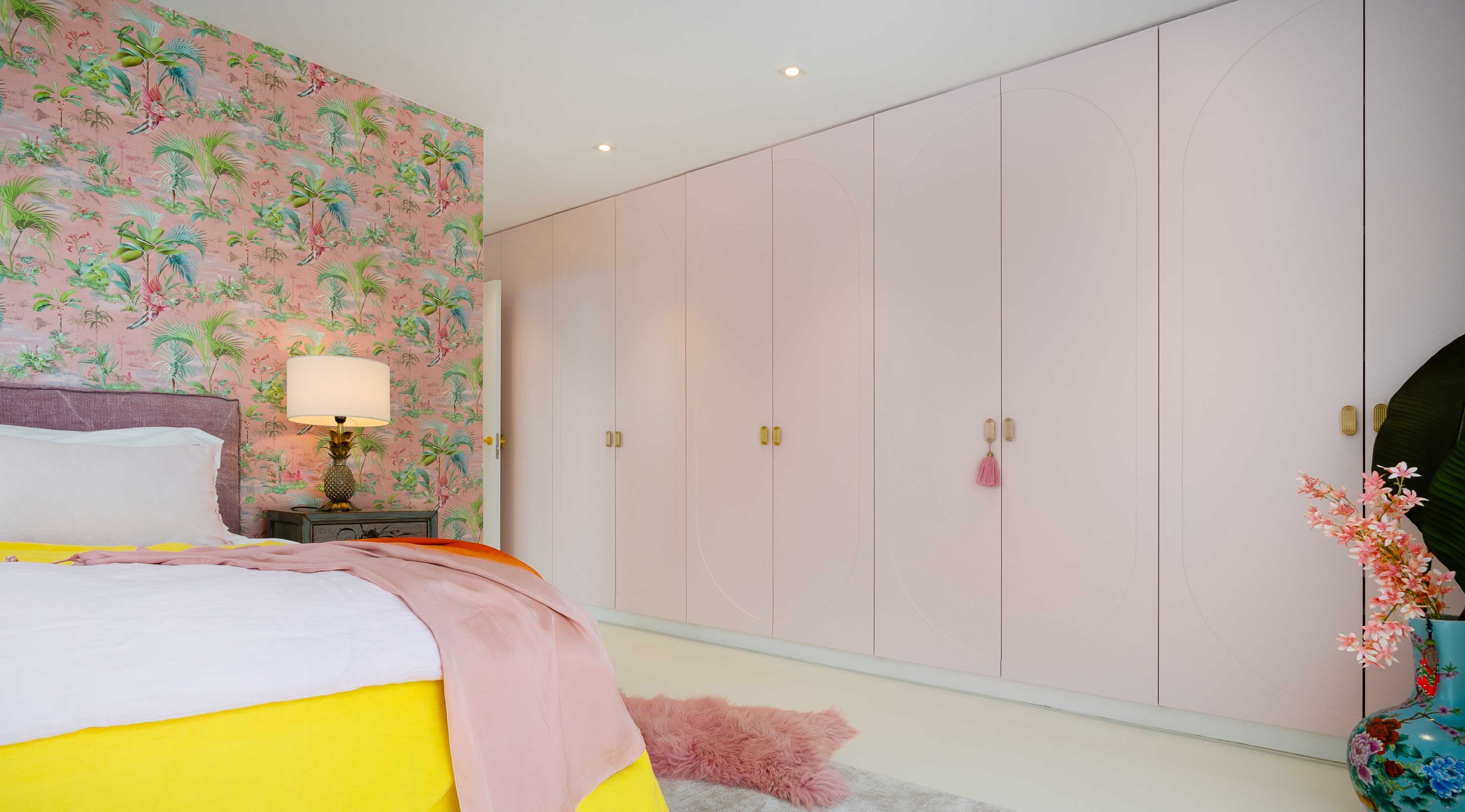 Leja has also played with the harmony of analogue colours (i.e. colours that are close to each other on the colour wheel and have a pleasant and balancing effect to the human eye). Large-format originals by Julio Rondo on the walls, adapted to the colourful interior, unite the complementary colour harmonies of pink-coral and yellow or pink tones from the analogue colour scheme. They also complement the colours of the interior design. In this way, an emotionally touching radiance is created in the room. The diversity and profundity of the colour design continues in the combination of different structures and materials. Smooth (plexi) glass surfaces, mirrors, and metal surfaces meet soft woollen carpets, fluffy sofa cushions, and cosy blankets. With a great deal of courage, free spirit, and sensitivity, Leja combines the most diverse materials and colours and transforms her visions into expressive reality.