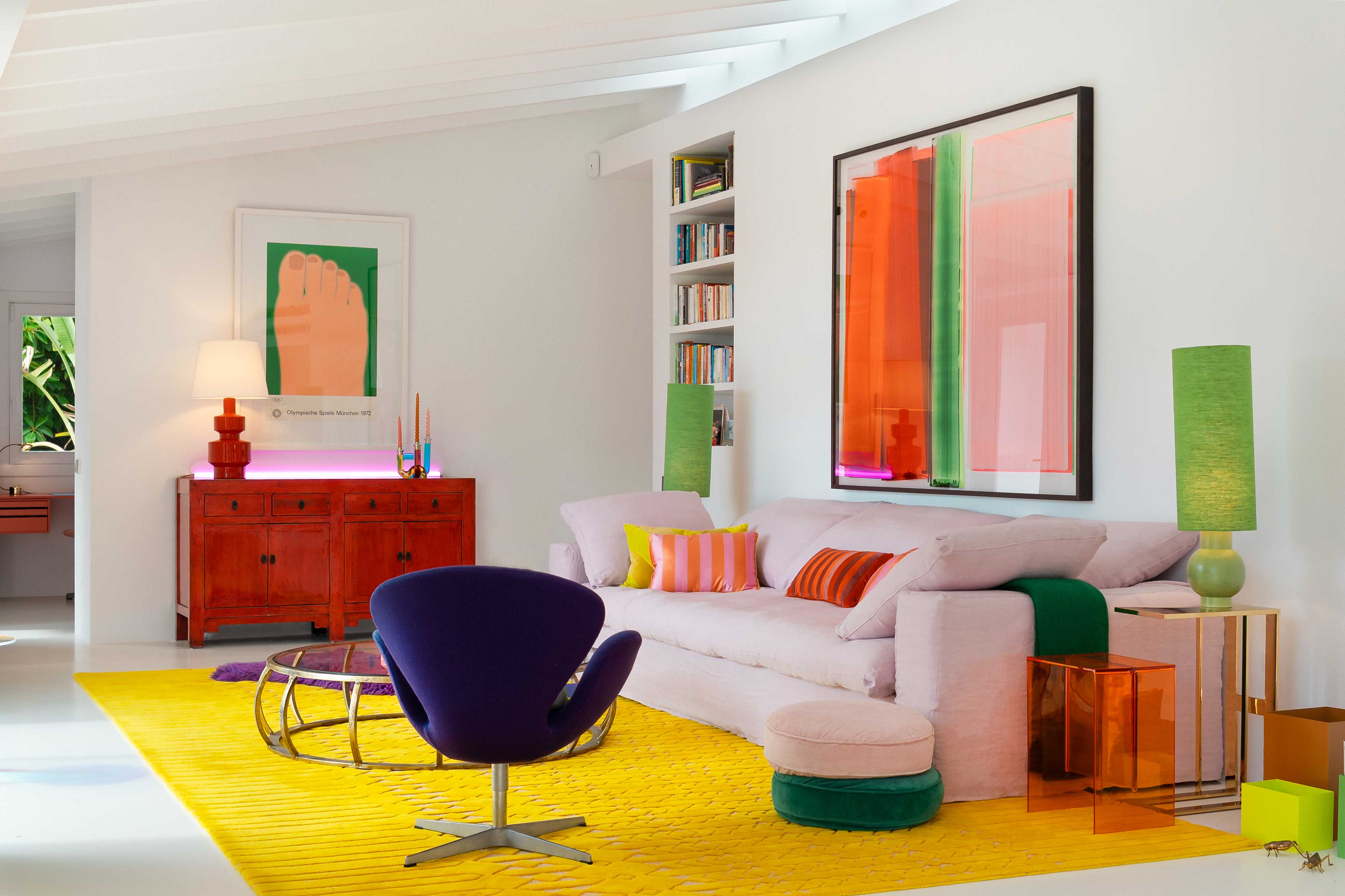 Leja’s designs focus on light, openness and, of course, colour – as the high-quality interior design of the house shows. Bright yellow, rich pink, red, and orange, and various shades of green – inspired by the surrounding Mallorcan nature – shape the character and stand for an carefree attitude towards life. A special feature is the combination of complementary colours such as purple on a yellow carpet or pink and red. These harmonise with each other in the highest luminosity.