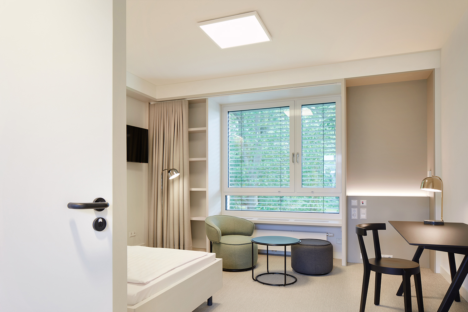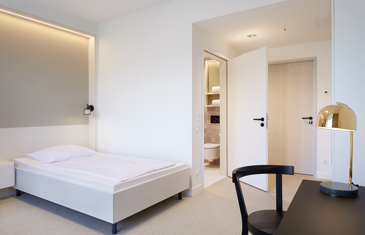 “The treatment concept is geared towards the realities of life and prepares patients specifically for everyday situations,” explains Dr Matthias Wilkening, Managing Partner of Wahrendorff. For example, there are various everyday training locations such as utility rooms and a “launderette”. The architecture of the building, with its skilful combination of indoor and outdoor spaces and a variety of lounges and meeting areas such as terraces, loggias, corridor extensions and group rooms, supports guests' needs for private and sheltered retreats or for social interaction. There are many opportunities here to find your way back into public life at your own pace.