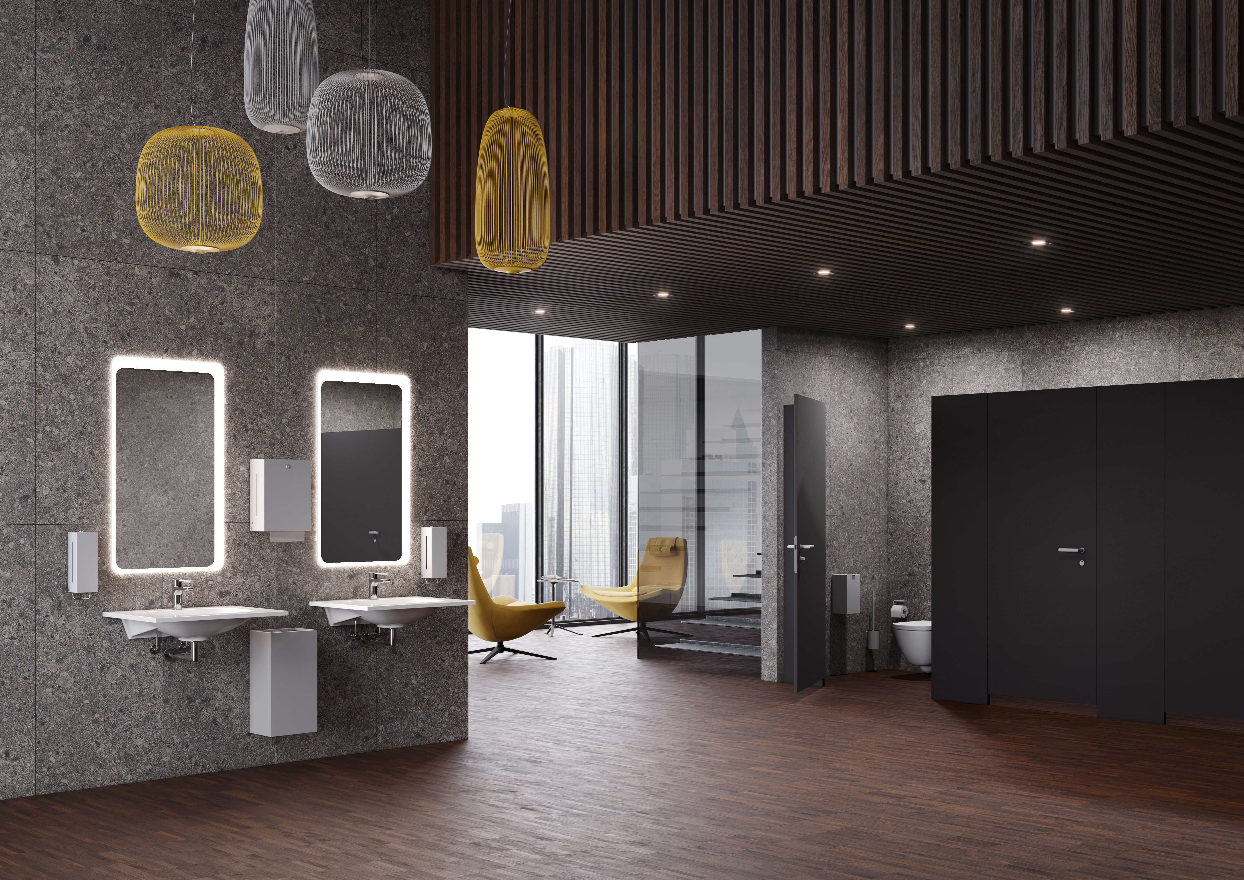 A new matching dispenser system is now available for the successful bathroom range System 900 in a choice of finishes: powder-coated in black, shades of grey and white, as well as stainless steel models. The dispensers are extremely robust and are therefore perfect for highly frequented sanitary spaces. A lock with a key offers protection against misuse. The majority of the dispensers is not only available in a manual but also in a Sensoric version. From soap and disinfectant to paper towel dispensers and waste bins, as well as hygiene combinations in various sizes, HEWI offers a matching functional range that is also meets the most discerning design standards.