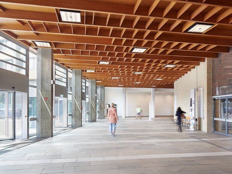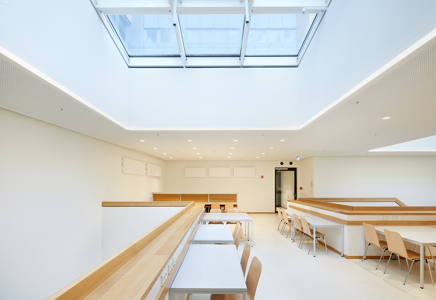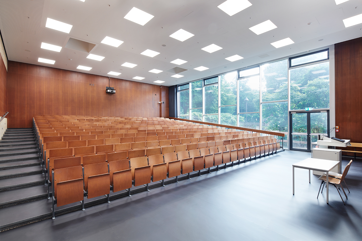 The Philosophers' Tower has a Z-shaped floor plan with four building sections and is characterised by its slender construction in the "Mid-Century Modern" style. The façade makes the building appear weightless and emphasises the vertical structures. The two wings house the faculties' seminar and student council rooms and offices. The centrepiece of the high-rise building and a major innovation is the merging of the previously separate libraries into a central library covering over 6,000 square metres, which now extends from the second to the sixth floor of the central middle building. An additional staircase and a library lift gave the library its own internal access.