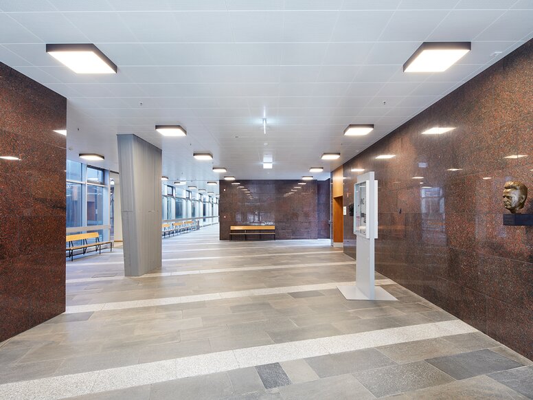 In addition to the refurbishment of the existing building, the usable space was to be expanded. The newly created "Cube" is a free-standing solitaire in the inner courtyard, spread over three storeys and provides around 900 square metres of space for additional student workstations and exchange between the student councils. The new extension is characterised by a polished stainless steel façade, which creates interesting effects and visual relationships thanks to its reflective properties. The façade contributes to a harmonious interplay of old and new by mirroring the historic façade and presenting itself in a visually restrained yet modern way. On the upper floor of the new building there is a light-flooded hall which, together with the four seminar and committee rooms on the ground floor, can also be used for events. The new building is connected to the existing building via bridges on three sides on the ground floor. Newly created meeting rooms in the listed main foyer and the refurbished canteen with an open-plan concept and new energy-efficient building services complement the uses on the ground floor.