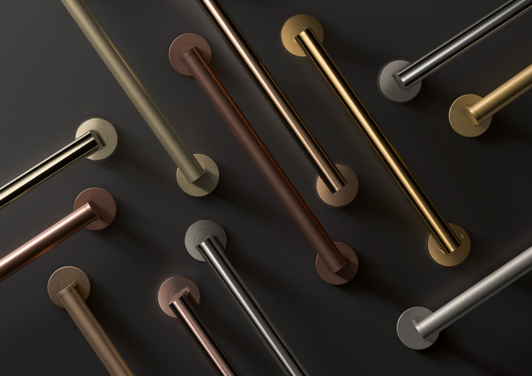 HEWI offers new surfaces using the environmentally friendly PVD process for maximum individuality in the bathroom.