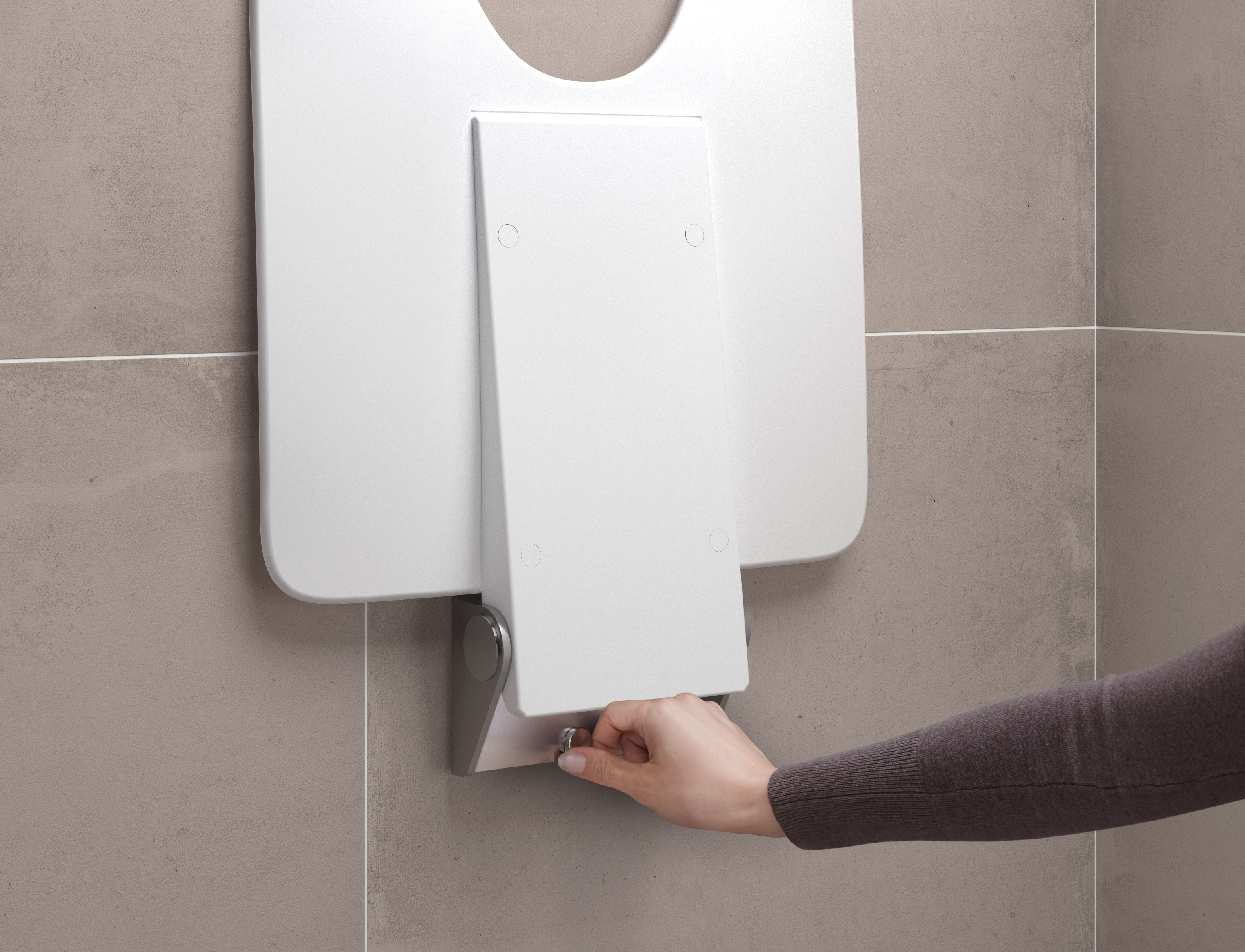 The mobile solutions are latched into a fixed mounting plate as and when they are needed. The particularly easy, toolless installation allows the care or cleaning personnel to add the mobile seat or mobile hinged support rail to the bathroom when it is needed. If the mobile solution is no longer required, a discreet cover conceals the mounting plate.