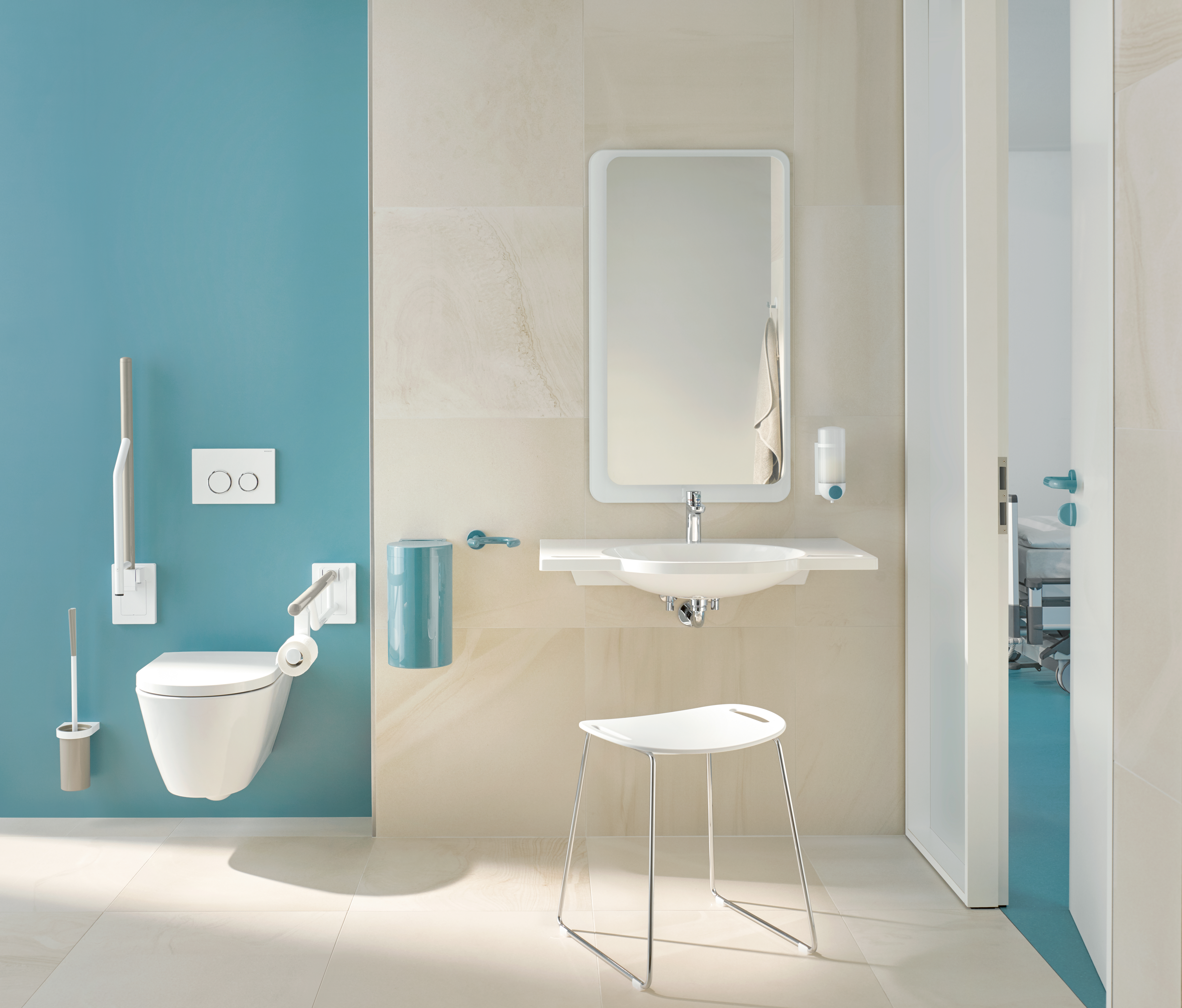 Functional elements can be designed in colour on request. The deliberate use of highly contrasting colours characterises the system made of polyamide – this facilitates orientation and makes intuitive use possible. Due to the material, System 800 K is especially suitable for the care sector. The non-porous surface is easy to clean and is pleasant to touch. Colourful accents in System 800 K create a feel-good atmosphere. The highly contrasting design of the functional elements highlights them clearly and therefore makes them easy for people with impaired vision to discern too.