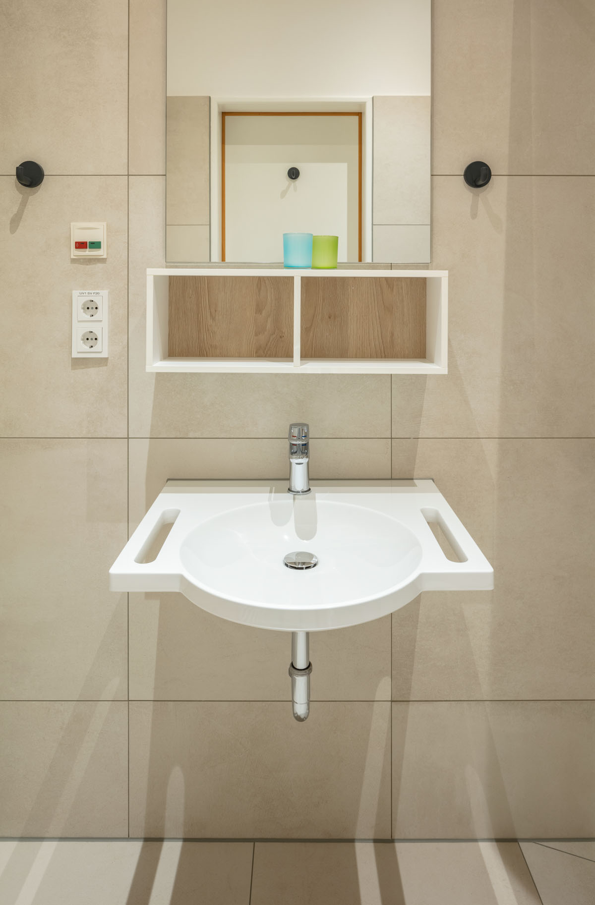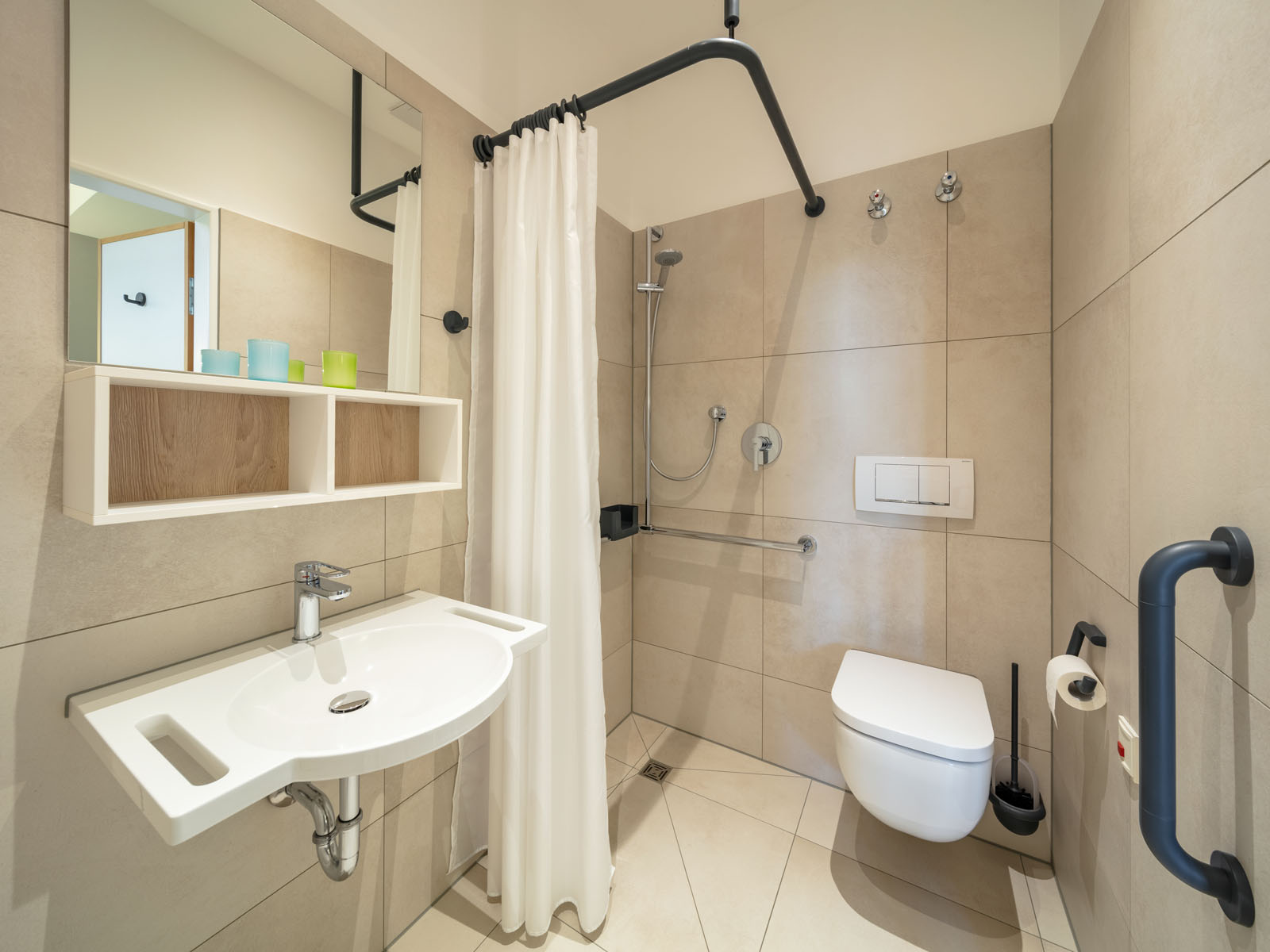 The HEWI washbasins with integrated accessibility are particularly useful. The shallow washbasin can be moved underneath and practical grab rails provide reliable support. These can also be used as towel rails.