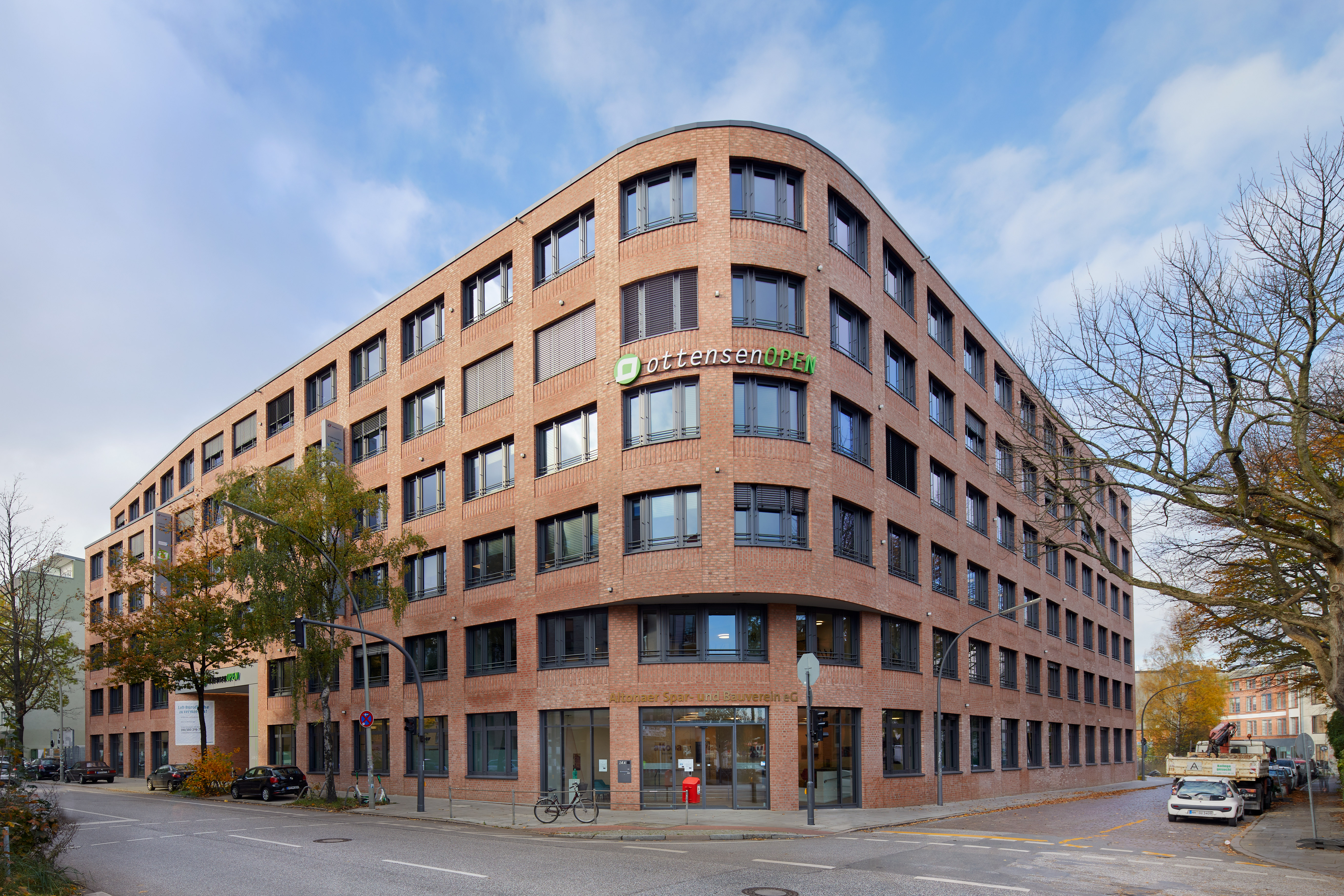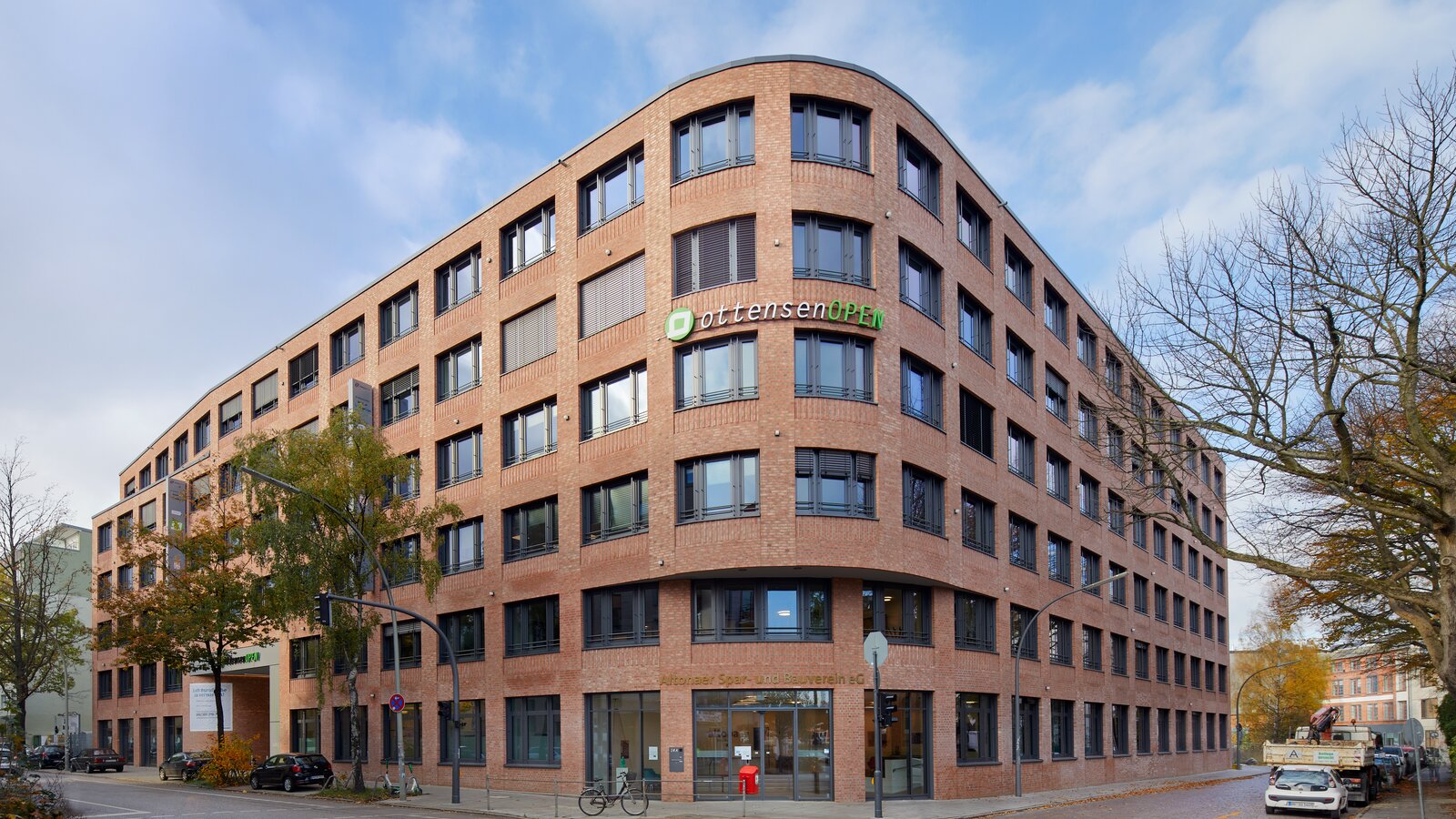 The ottensenOpen office building has an above-ground area of around 12,600 square metres. The building was deliberately designed in such a way that the space can be used very flexibly and different sized units can be formed as required. Thus, use is possible both in the form of individual and team offices as well as in the form of open work areas. The Altonaer Spar- und Bauverein housing association has set up its new office on the ground floor and parts of the ground floor.