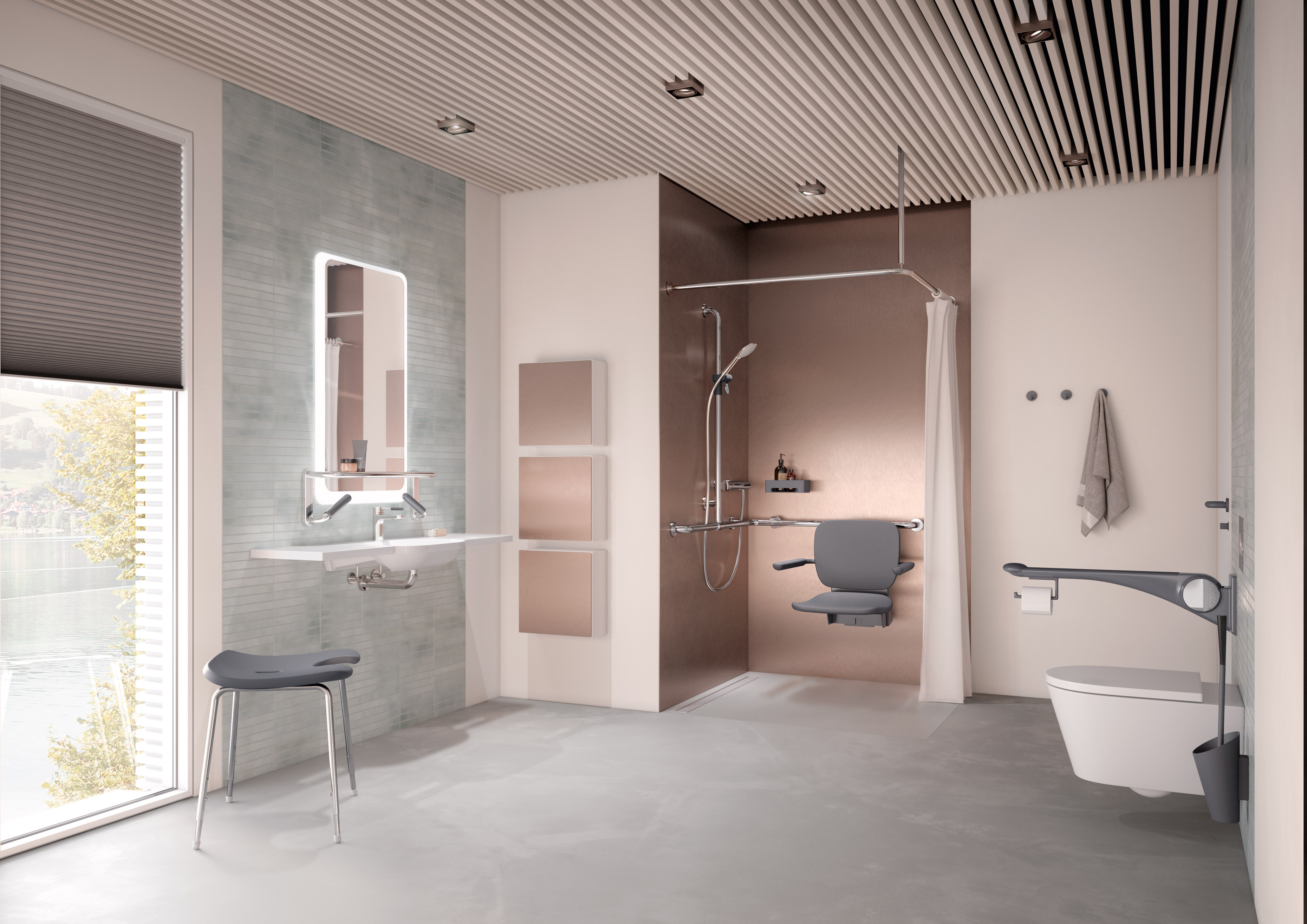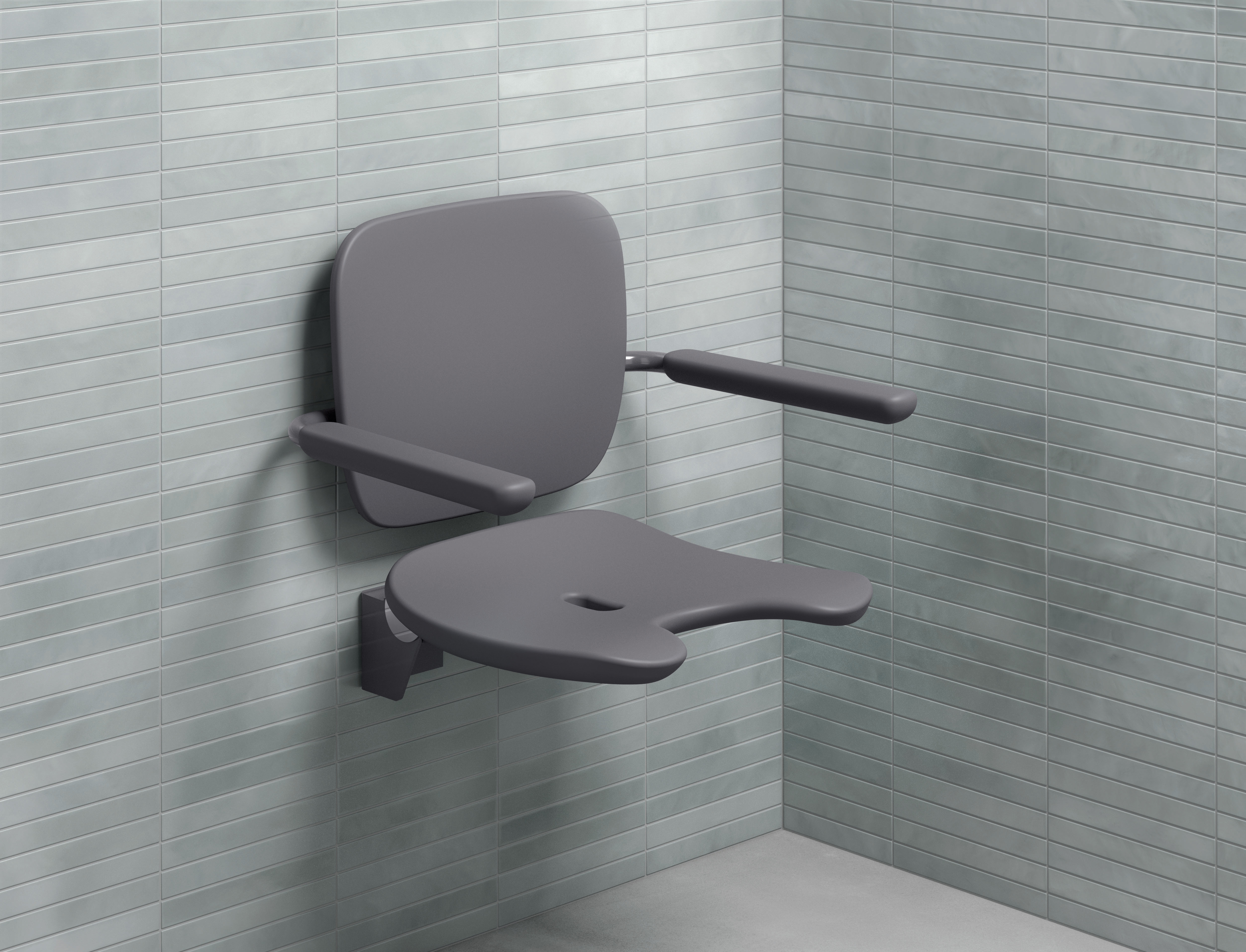 The professional care system from HEWI has a new look. The flexible, adaptable and expandable system impresses with a modern style in the new design. The chrome accents have been retained as a design element and stand as a recognition value for the system. The style puts people in the foreground and promotes the independence of the users. Additional functions that can be put together individually, such as the height-adjustable plate for the seats and hinged support rails, also guarantee comfortable use of the products for everyone.