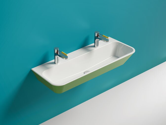 There are also suitable products for children: The HEWI washbasins for kids impress with their fine radii, which focus on the safety of the little ones. In addition to washbasins, the product range also includes mirrors. HEWI therefore meets the requirements for product solutions for kindergartens, daycare centres and schools. In addition to single and double washbasins, there are also row washbasins with height offset. In addition to classic white, HEWI offers a two-colour version in cheerful apple green or bright aqua blue.